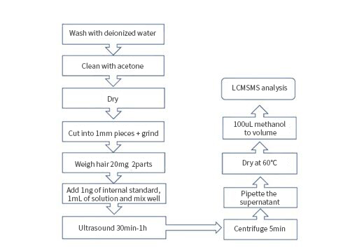 2. In the standard, the hair is washed, dried, cut into pieces, weighed, and ground after adding the internal standard solution.