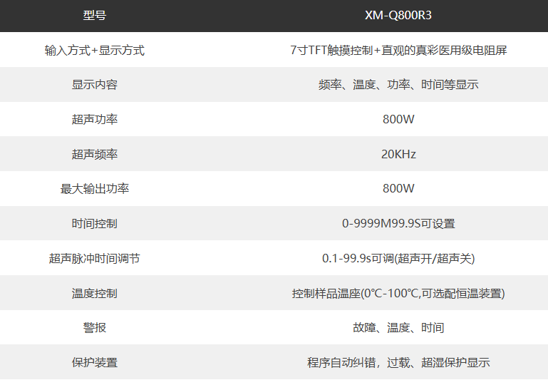 產(chǎn)品簡(jiǎn)介:非接觸超聲波破碎機(jī)XM-Q800R3由可編輯的數(shù)字系統(tǒng)控制,可精確設(shè)定振幅、頻率、時(shí)間、溫度及溫度報(bào)警功能,是一款具備高重復(fù)性實(shí)驗(yàn)結(jié)果的產(chǎn)品,聚能式剪切無(wú)需旋轉(zhuǎn)樣品支架,就能充分快速的剪切樣品,保證樣品處理的均一性。